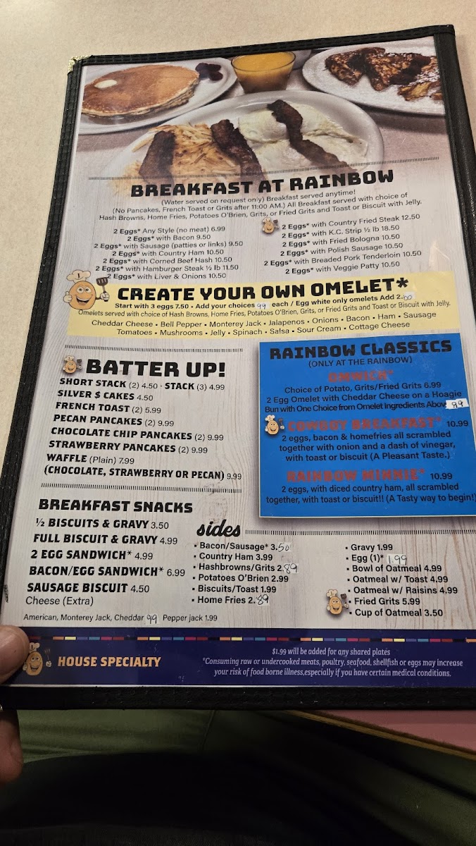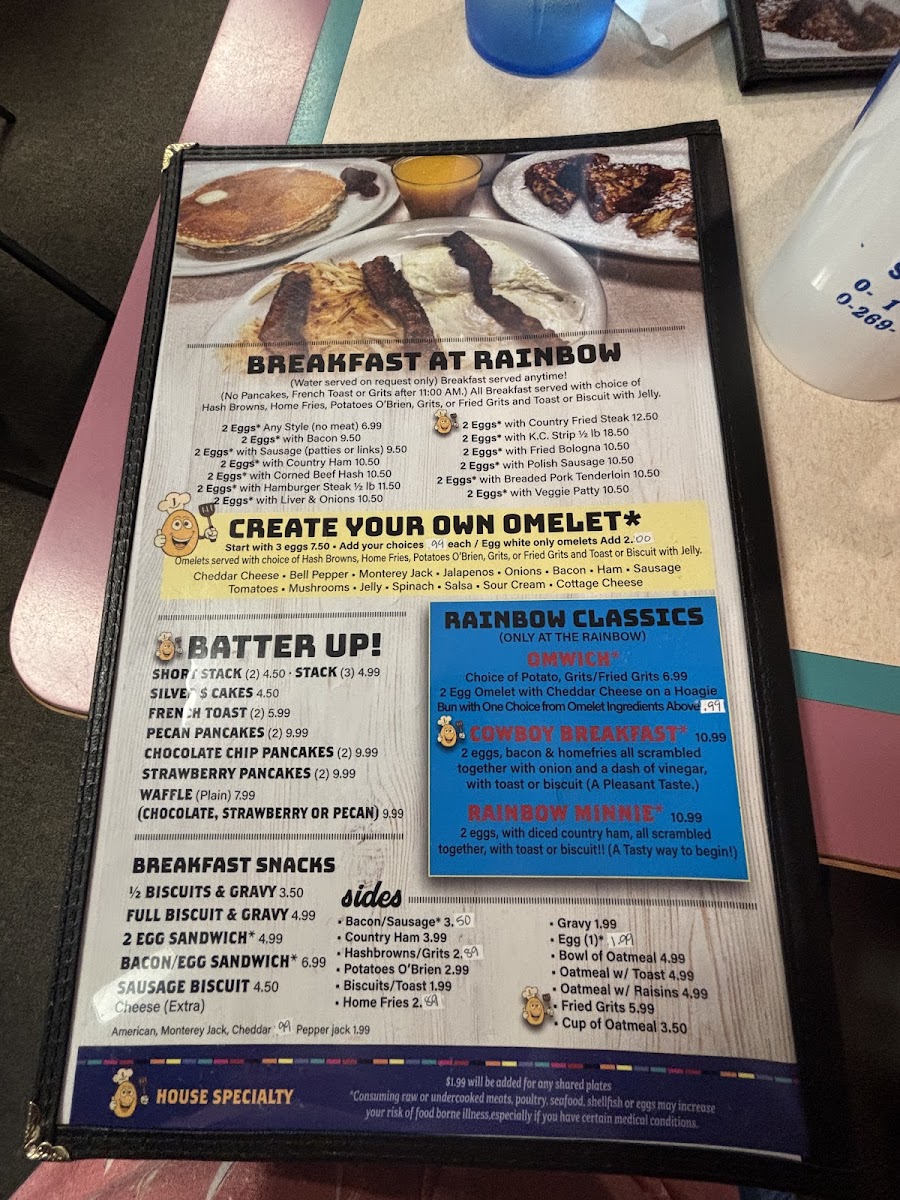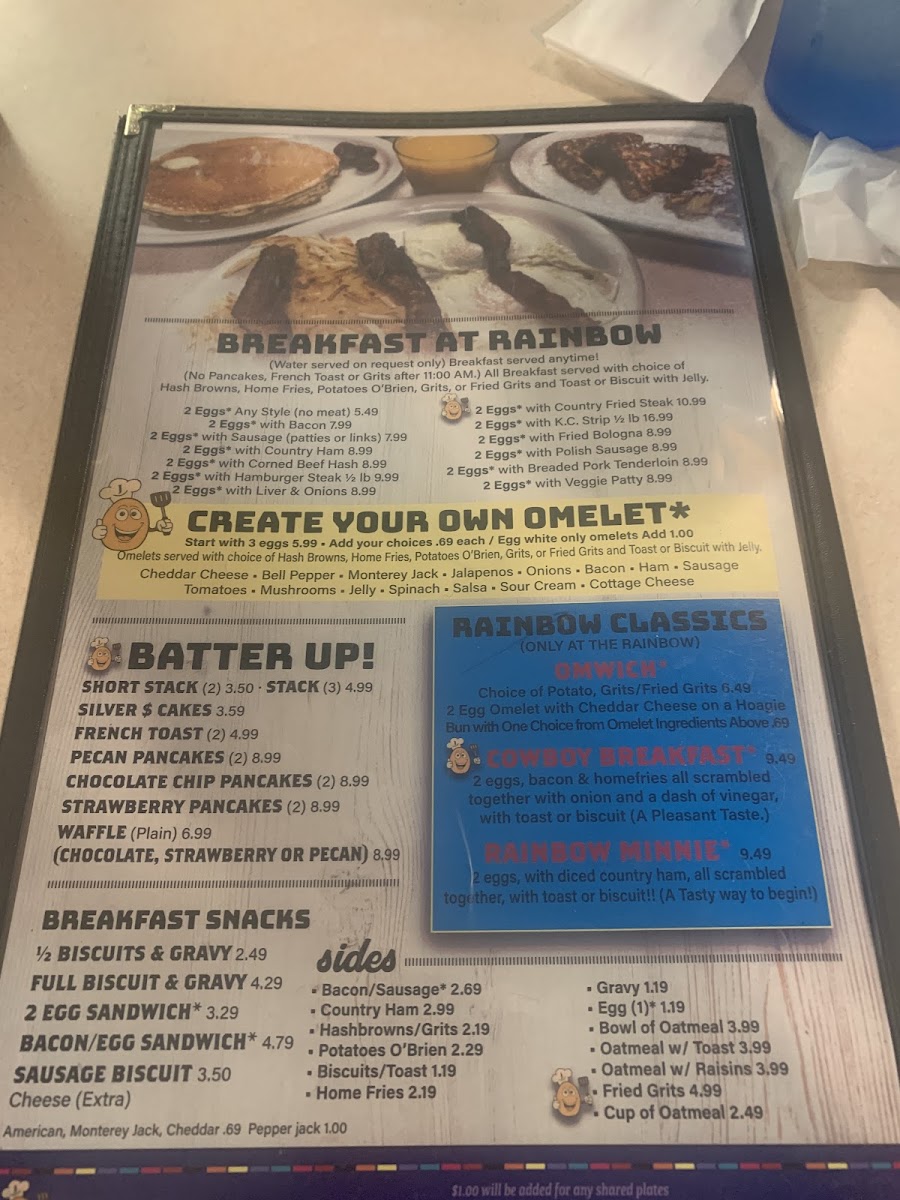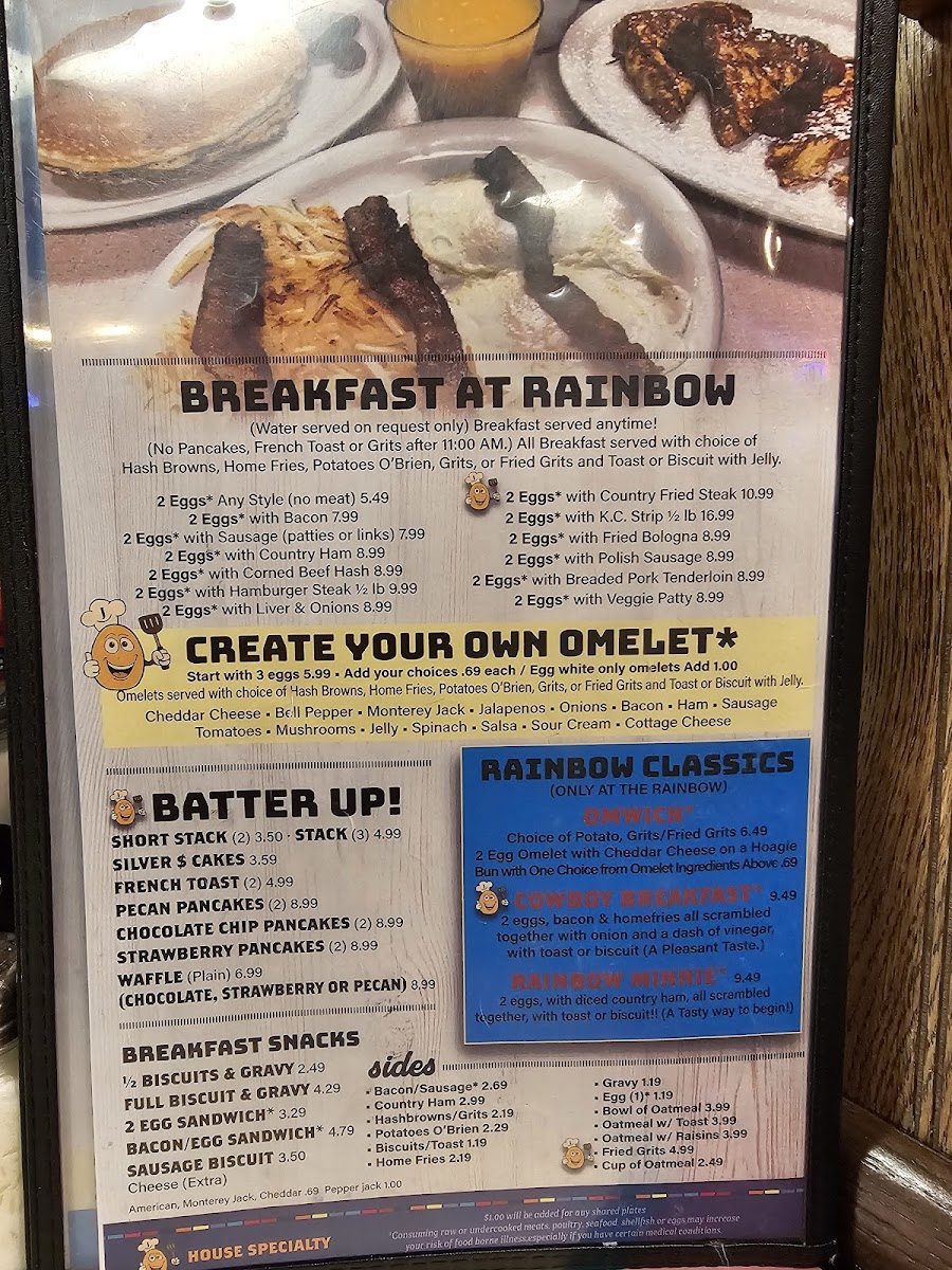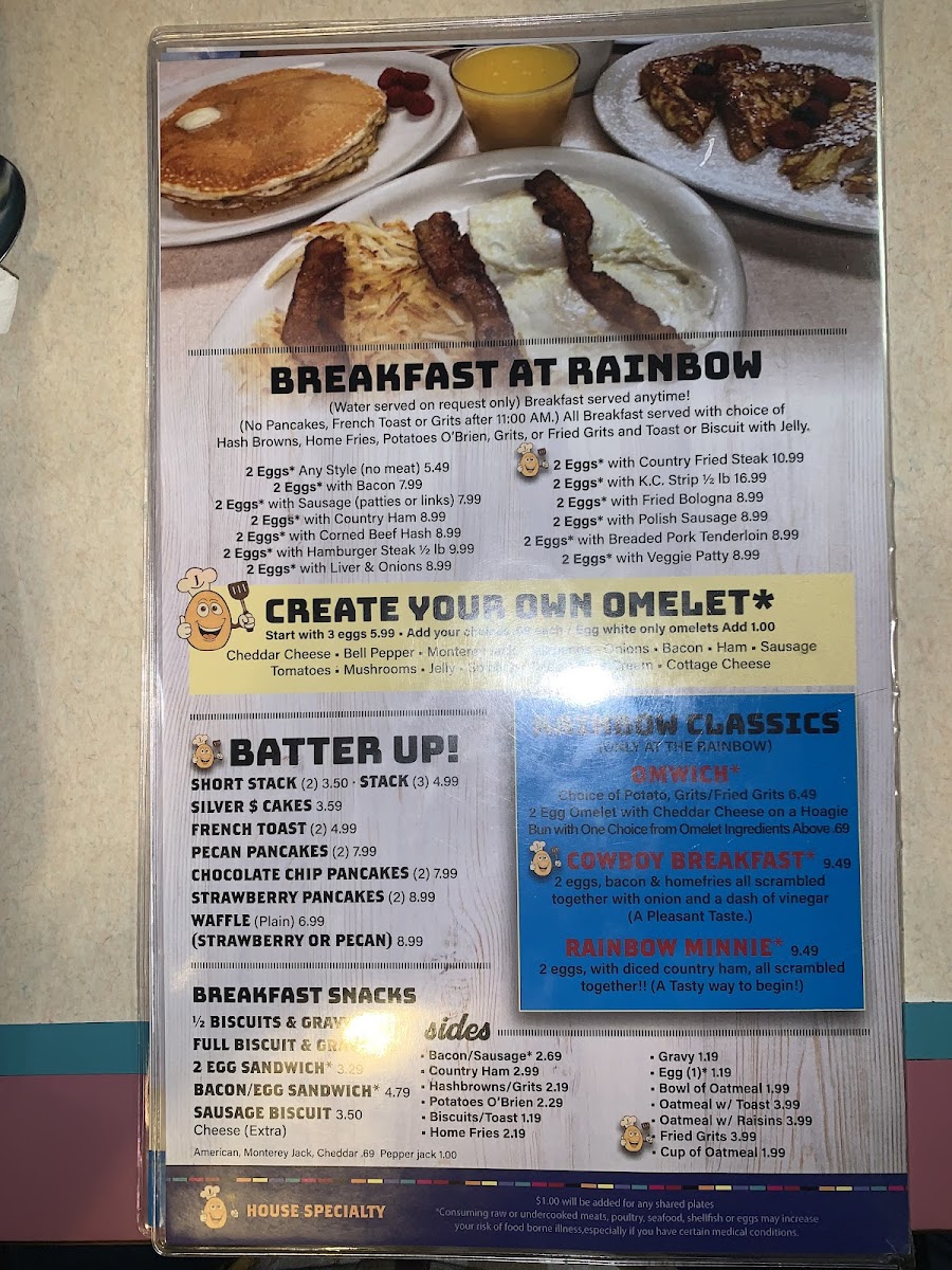 The menu at P J's Rainbow Cafe offers a comforting selection of classic American and breakfast dishes served in a casual, homey setting. Whether you’re stopping by for a relaxed morning meal or a satisfying lunch, the menu’s simple, hearty options invite you to enjoy familiar flavors made with care.